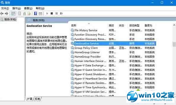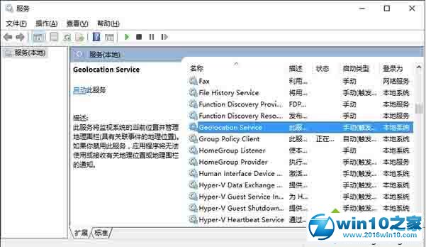 2、在服务中找到名为Geolocation service的服务,双击打开其属性。