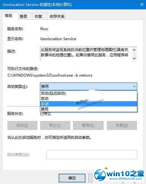 3、在属性中将Geolocation service服务启动类型设置为手动,点击“确定”保存设置;