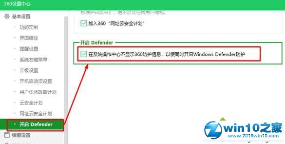 3、在记本功能中找到windows defender选项,将开启defender选项勾选即可。
