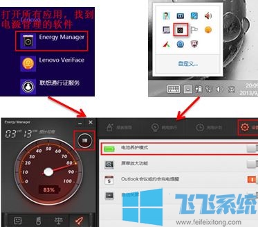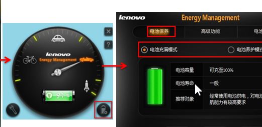 4、电源管理8.0:你好,你在桌面的右下角找到向上的箭头点击→找到一个小汽车的图标点击→出 来一个energy management的界面,找到界面中第二栏的电池模式,选择电池中的最长续航时间。